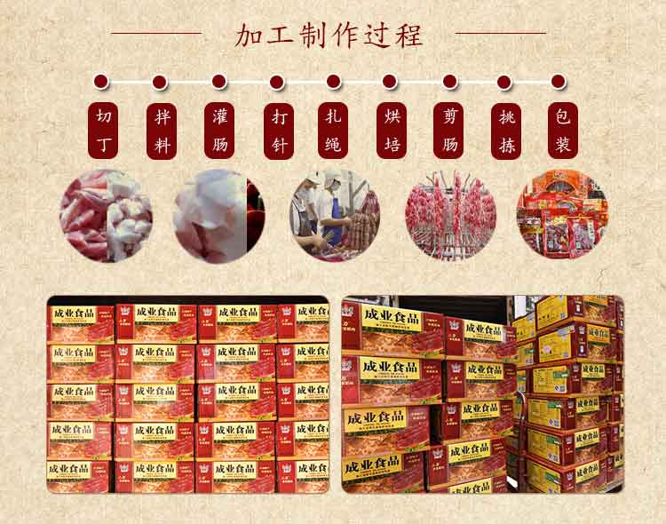 结合现代科技与古典工艺的流程,利于保鲜及运输,让更多的老广可以享用到自家味道的成业东莞腊肠。